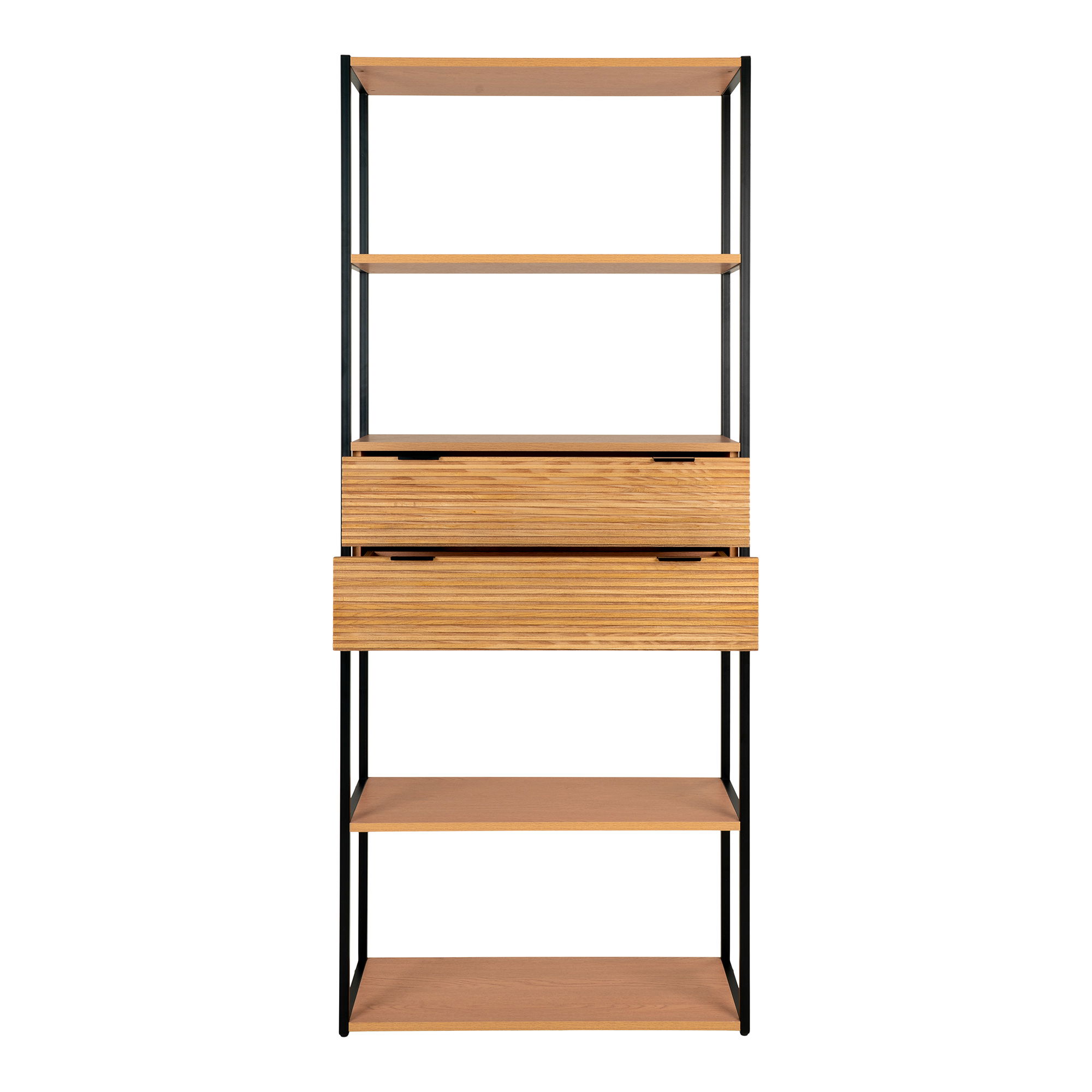 Knygų lentyna, uosio lukštas, juodo plieno rėmas, 2 stalčiai 84,5x35x200 cm