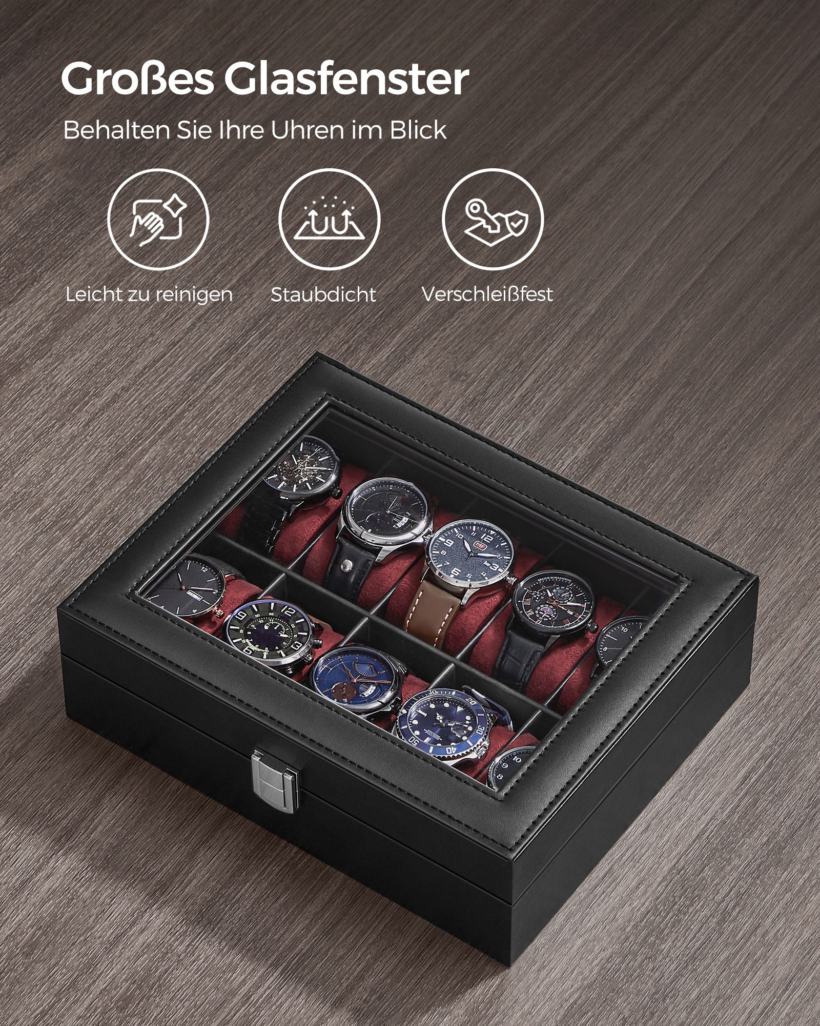 Laikrodžių dėžutė su 10 skyrių ir stikliniu dangteliu | Vyriškų aksesuarų dėžutė | Juoda